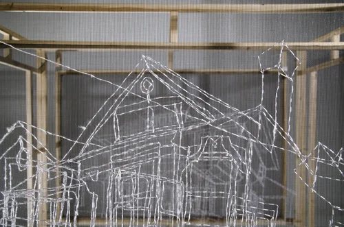 Linoleum tile, faux brick and faux stone are stitched into a wood frame to make “Map of Saint Anthony Village.” This free-standing sculpture takes the form of a narrow room divider or privacy screen.