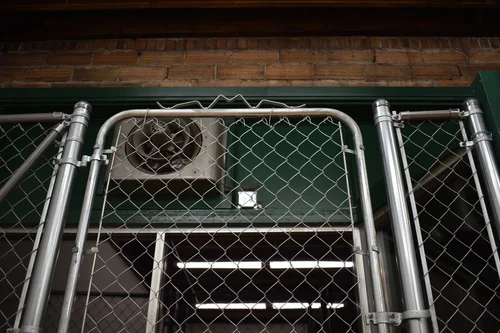 Chainlink fabric, galvanized aluminum pipe, steel hardware, cedar, pine, latex paint, plastic “pet peek bubble”